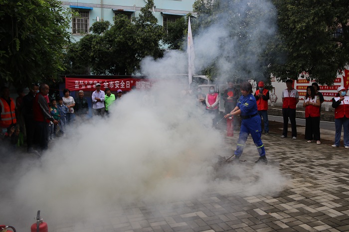在小区文化生活广场,信阳红十字蓝天救援队志愿者采取理论讲解、观看视频、现场演示、教学互动等方式,为小区群众讲授了火灾相关知识、灭火器使用方法、预防火灾重点等。