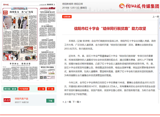 信阳市红十字会以“四个专项行动计划”为重点,紧紧围绕市委市政府中心任务,全面履行法定职责,聚焦红会核心业务,着力加强人道宣传阵地建设,充分利用报刊、电视台、网络等新闻媒体,报道宣传红十字会工作,传播正能量,通过媒体打通红十字文化通向全社会的传播渠道。2018年,先后在《中国红十字报》刊登“信阳红会积极开展红十字进社区活动”等文章61篇,在《中华骨髓库通讯》刊登“信阳市造血干细胞捐献者胡武堂荣获新县劳动模范荣誉称号”等文章2篇,在《河南省红十字会网站》刊登“省红十字进社区专项行动观摩会在信阳召开”等文章55篇,在《信阳日报》刊登“信阳市红十字会结伴同行脱贫路助力攻坚”等文章27篇,在《信阳晚报》刊登“500台平板电脑送山区学生 市红十字会携手爱心企业家为我市学生捐赠价值120万元平板电脑”等文章29篇,在《信阳新闻联播》等电视台播放“红十字天使计划为贫困家庭患儿提供基金资助”等报道32次。全方位的讲好红十字故事,传播好红十字声音,为广大群众及爱心人士搭建一个参与公益事业的平台,让“人道、博爱、奉献”的红十字精神深入人心,推动了红十字事业的健康发展。