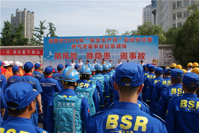 5月31日上午,信阳市2019年“安全生产月”启动仪式在信阳市富地燃气公司举行,信阳红十字蓝天救援队应邀参加了以“防风险、除隐患、遏事故”为主题的“安全生产月”宣传活动。