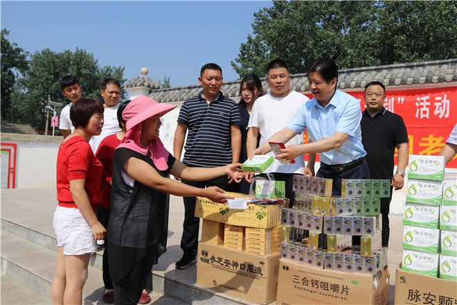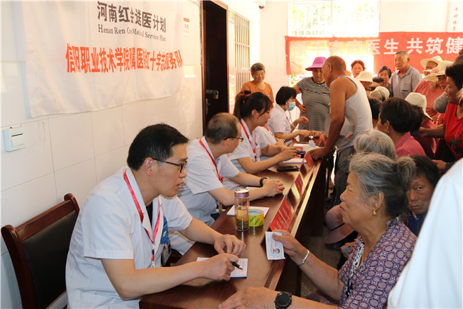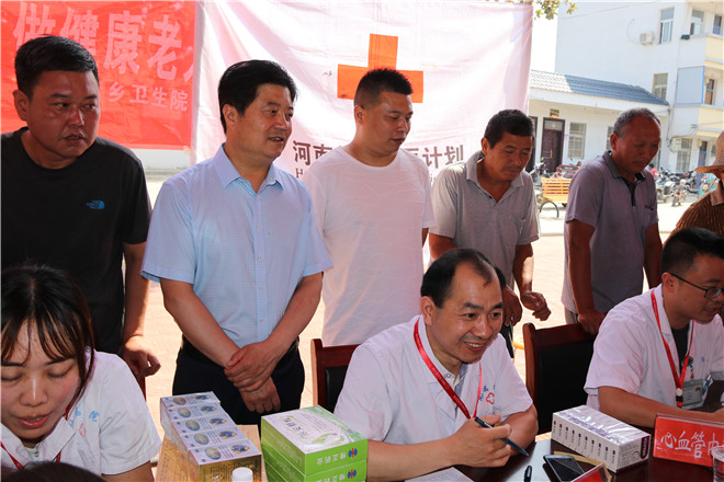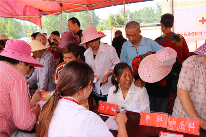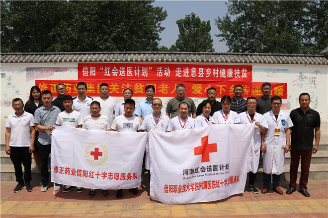6月14日,信阳市红十字会常务副会长李俊杰带领市第二人民医院医疗专家和修正药业20名红十字志愿者来到市红十字会帮扶村息县关店乡吴村铺村开展“红会送医计划”义诊志愿活动。
