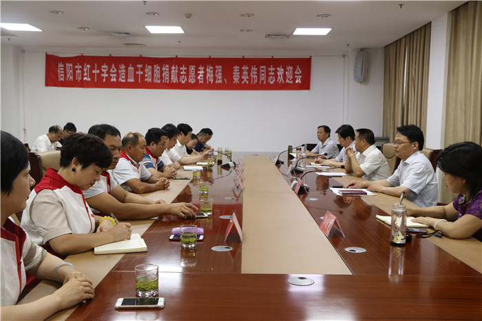 8月1日,信阳市红十字会举行梅强、秦英伟两位同志成功捐献造血干细胞归来欢迎会。市政府副市长、红十字会会长邵春杰、市红十字会常务副会长李俊杰出席会议并讲话,市政府办公室副主任甘蔗主持会议。