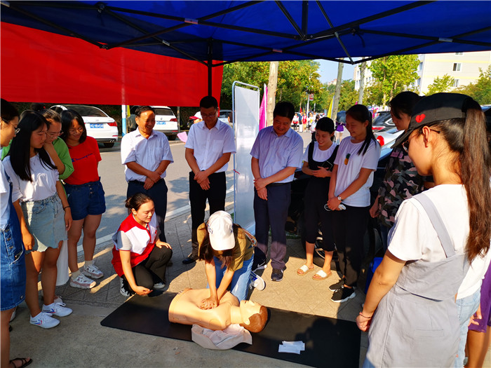 在活动现场,信阳市红十字会工作人员及红十字志愿者通过发放宣传材料,悬挂横幅、募捐海报、微信扫描小程序、微信朋友圈等方式,积极宣传动员广大师生身体力行积极参与“彩虹视界信阳在行动”、“信阳红会医路有爱”线上募捐,并以生动多样的形式弘扬红十字精神。在活动现场,信阳市红十字会还组织了应急救护培训师对围观师生进行心肺复苏救护技能培训,详细地为同学们讲解了人工呼吸、胸外心脏按压等急救方法,全面提高了高校师生的应急救护能力。