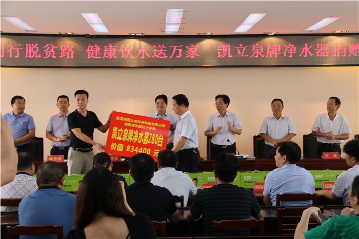 捐赠仪式上,深圳市凯立泉环保科技有限公司区域经理曹世达代表爱心企业,向信阳市红十字会捐赠单价2980元/台的凯立泉牌净水器280台,总价值83.44万元,主要用于改善浉河区区直医院、社区卫生服务站、各乡镇卫生院、村卫生室和广大就医患者生活饮水质量。曹世达表示,凯立泉公司将用3-6个月左右的时间为受赠单位免费进行安装,且在自安装日起3年内质保及全免费更换滤芯服务,期间不涉及任何收费项目,以弘扬“人道、博爱、奉献”的红十字红精神,回报基层卫生系统对全民健康所作出的贡献。