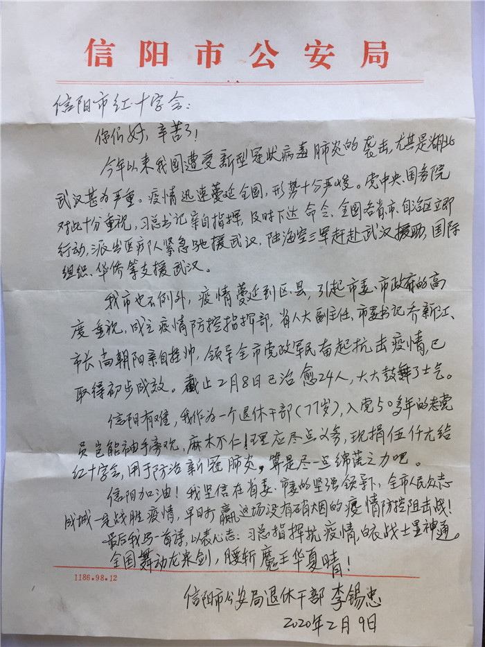 今年77岁的李锡忠是一位市公安局退休干部,也是一名有着50多年党龄的党员。他在信中写到:信阳有难,我作为一个退休干部(77岁),入党50多年的老党员岂能袖手旁观,麻木不仁!理应尽点义务,现捐伍仟元给红十字会,用于防治新冠肺炎,算是尽一点绵薄之力吧。信阳加油!我坚信在省委、市委的坚强领导下,全市人民众志成城,一定战胜疫情,早日打赢这场没有硝烟的疫情防控阻击战!