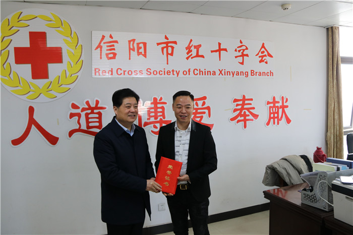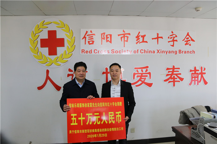 1月29日上午,我市爱心人士、家咏乐闻服饰连锁店负责人徐家震向信阳市红十字会捐赠人民币50万元,定向用于支援信阳市新型冠状病毒感染的肺炎疫情防控工作。善款已于28日下午到达市红十字会账户。