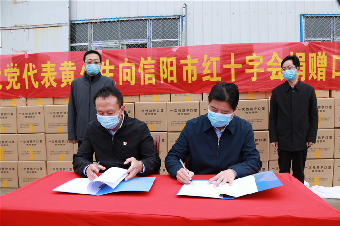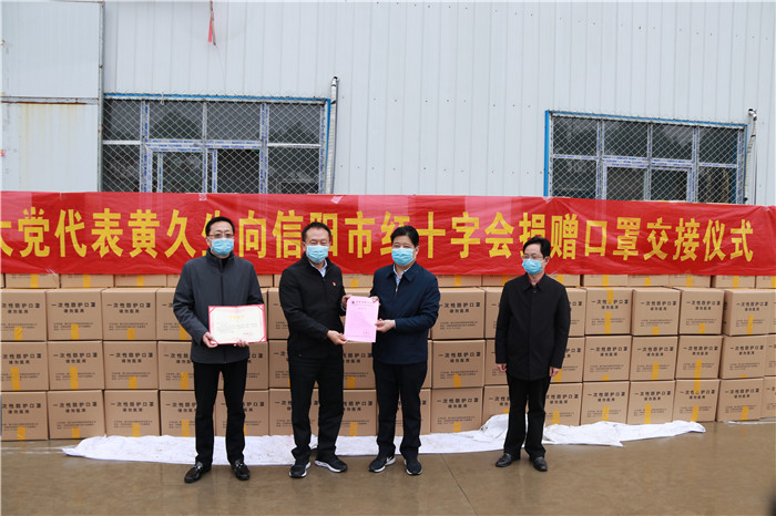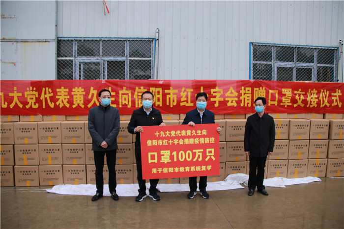 4月20日,十九大党代表、第十三届全国人大代表、潢川县驻郑州党工委书记黄久生,向信阳市红十字会捐赠口罩交接仪式在潢川县圣宇服饰科技有限公司举行,市、县红十字会负责同志和捐赠方、受捐方代表参加交接仪式。