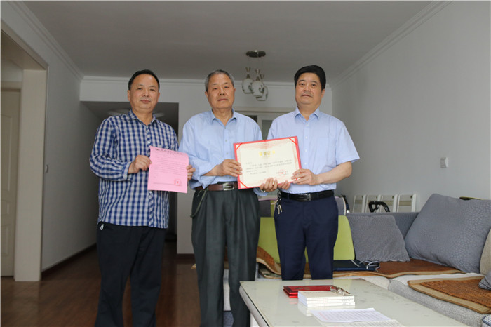 5月13日,信阳市红十字会常务副会长李俊杰带领红十字志愿者来到市公安局退休干部李锡忠老人家中,向他为“抗疫”捐款奉献爱心表示崇高敬意和关心,并为他颁发了捐赠荣誉证书。