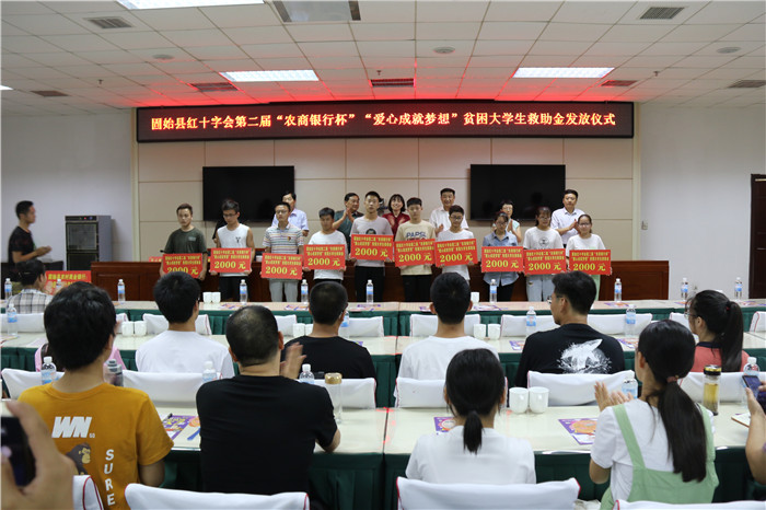 县农商银行行长杨世宽代表固始农村商业银行向县红十字会捐赠救助金10万元,彭仁群为县农商银行颁发了捐赠证书。县红十字会常务副会长梅世民介绍了此项活动的申请、核实、公示等相关程序并宣布了救助名单。仪式现场向47名大学新生发放了救助金。