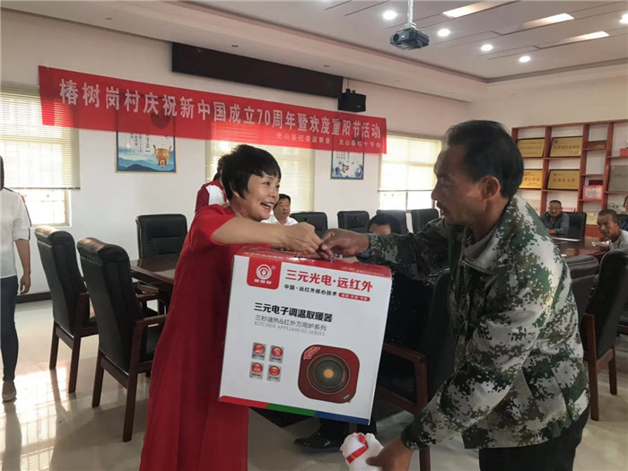 在国庆节和重阳节到来之际,9月29日上午,弦山街道办事处椿树岗社区一楼会议室内传来阵阵欢声笑语,县红十字会、县纪委监察委驻村工作队、河南三元光电科技有限公司、村“两委”干部和村30余名五保老人欢聚一堂,共同庆祝新中国成立70周年和即将到来的九九重阳节。