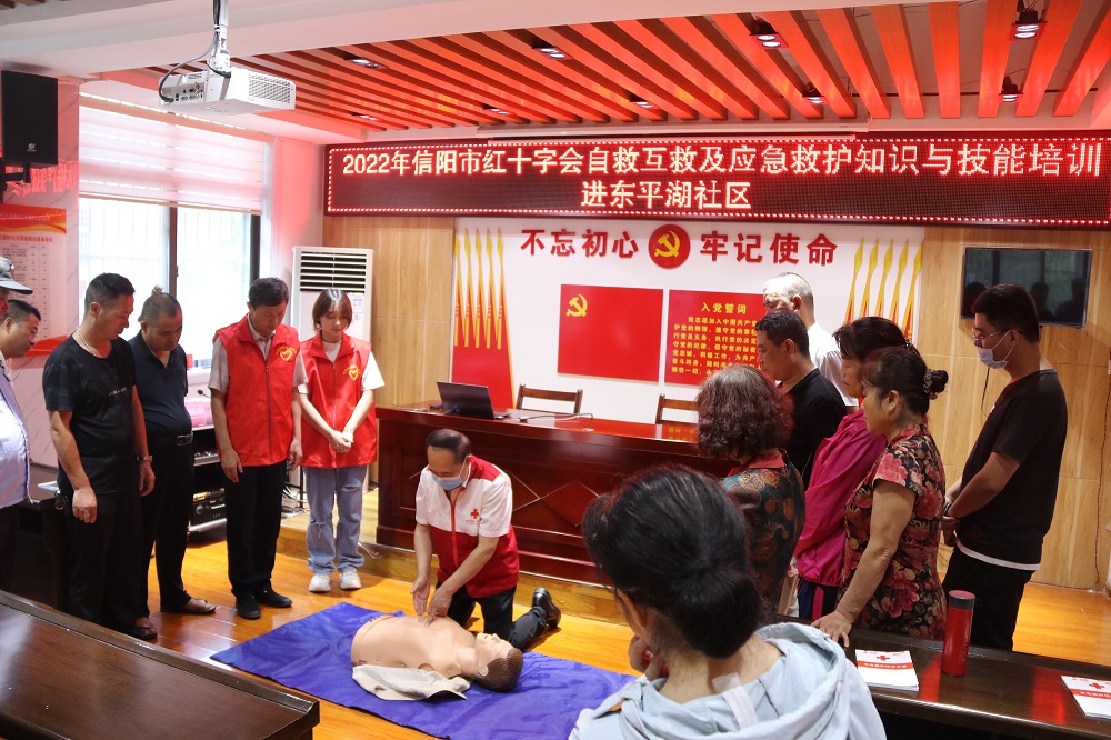 为增强社区居民应急救护意识、普及应急救护知识、提升应急救护技能,按照市直工委、市红十字会《关于开展“支部联支部”应急救护进社区活动的通知》要求,2022年7月25日下午,信阳市红十字会联合信阳市委办公室在其结对的东平湖社区,开展应急救护知识普及培训活动。