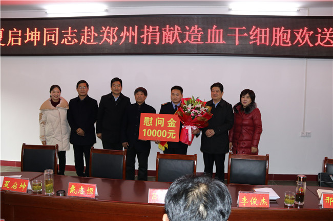 欢送会最后,参加欢送仪式的各级领导为夏启坤同志送上鲜花和慰问金,与会全体人员与夏启坤同志合影留念,据悉,夏启坤将于19日前往郑州,24日正式捐献。