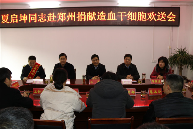 1月17日下午,新县第2例造血干细胞捐献者欢送会在县红十字会隆重举行。夏启坤是我县第2例、信阳市第20例成功配型造血干细胞的志愿者。信阳市红十字会常务副会长李俊杰,专职副会长邢国芝,县委书记吕旅,县人民政府副县长、红十字会会长戴志恒出席欢送会,县政府办、县委宣传部、县卫计委、总工会、团县委、退役军人事务局、广播电视台、新县网等单位和媒体负责人;县卫生计生监督执法所、红十字会工作人员参加了欢送会。