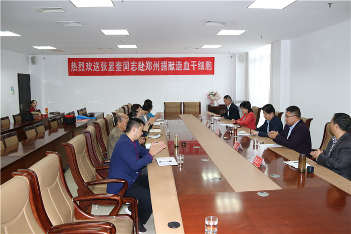 10月10日,信阳市红十字会在市行政中心举行张显奎同志赴郑州捐献造血干细胞欢送会。常务副会长李俊杰参加会议并讲话,副会长邢国芝主持会议。