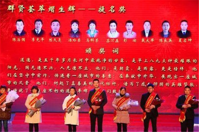 提名奖颁奖词:道德,是五千年岁月长河中最纯净的甘霖,是早上八九点钟最耀眼的阳光。国无德不兴,人无德不立。他们,是朝霞,是雨露,更是榜样。他们在坚守中前行,传递着一座城市的善意;在奉献中升华,展现出一座城市的风骨。他们,树起了真善美的时代标杆,谱写了感人肺腑的英雄赞歌,更铸就了一座座不朽的道德丰碑。
