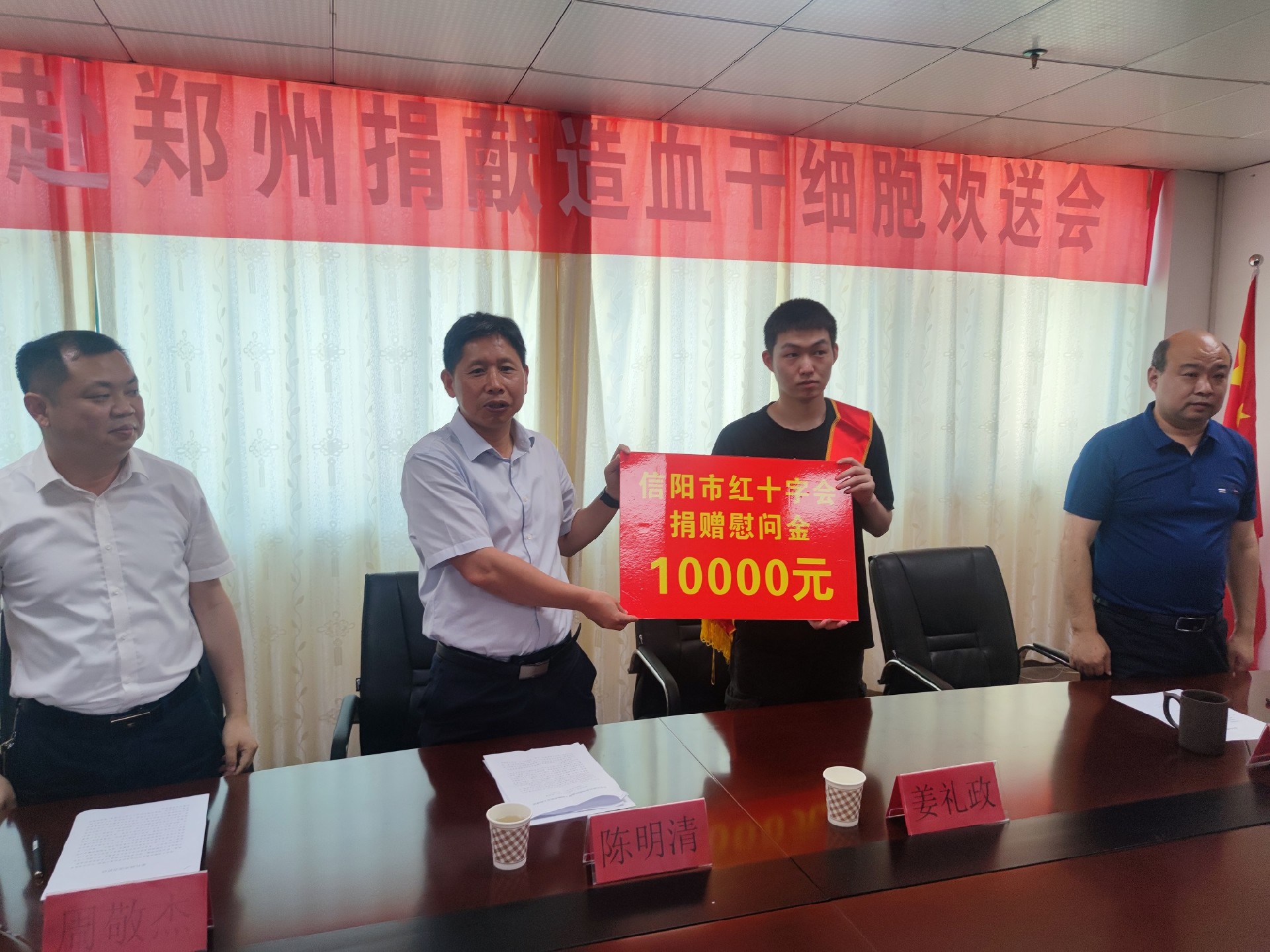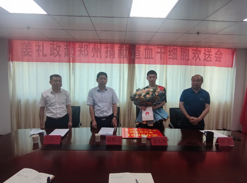 6月17日,羊山新区卫健委为姜礼政赴郑州捐献造血干细胞举办欢送会。市红十字会党组书记陈明清,新区党委委员、副主任周敬杰参加欢送会。