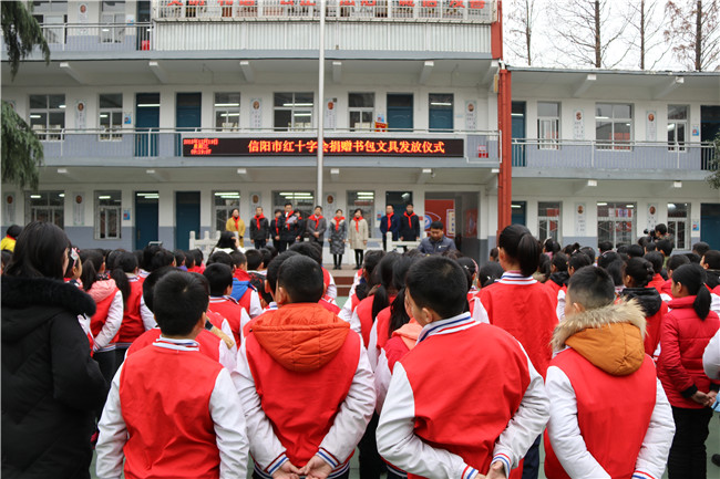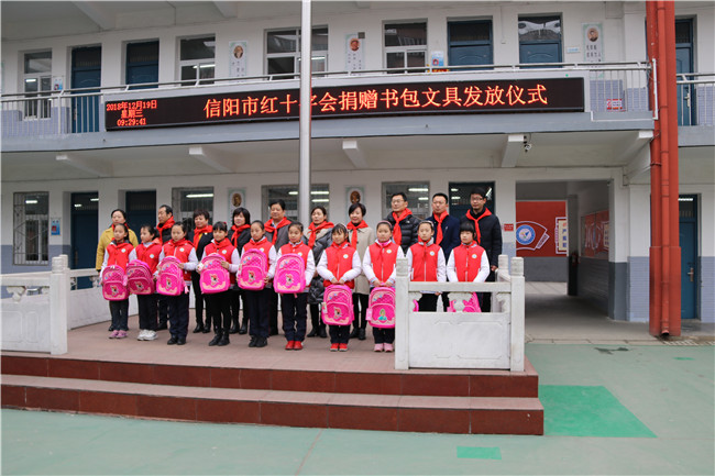 12月19日,信阳市红十字会在信阳市五小举行学习用具捐赠“送温暖”活动,为信阳市造血干细胞成功捐献者王立明所在学校捐赠价值26400元的书包、文具等学习用品200套。市红十字会常务副会长李俊杰、副会长邢国芝参加活动。
