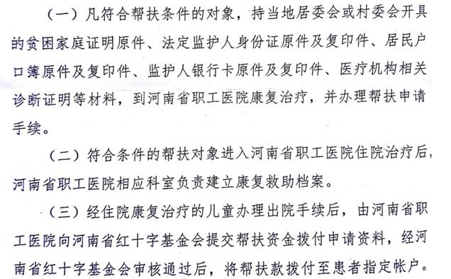 凡拥有河南户籍、家庭贫困,经二级甲等及以上医院诊断、符合康复训练条件的0至6周岁脑瘫、自闭症儿童,均可向河南省职工医院申请救助,每人可享受每年最高1万元的救助资金。