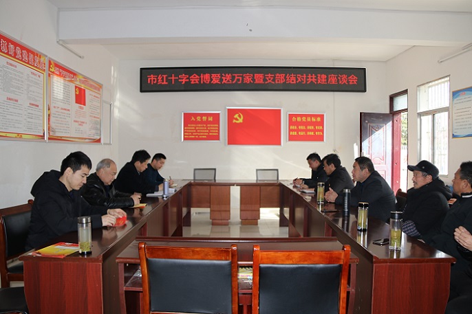 慰问活动结束后,在村部会议室召开了支部结对共建座谈会。座谈会首先听取了驻村第一书记胡浩同志2020年以来驻村工作情况汇报,陈明清书记在点评中指出,“三农”工作是我党的重要任务,脱贫攻坚更是国家的重大战略,扶贫工作是一件光荣的事情,作为一线的扶贫工作人员,要以高度的责任感和爱心投入到扶贫工作中。胡浩同志驻村以来,工作认真负责,态度端正,成效显著,在脱贫攻坚全面转入乡村振兴的关键时期,要继续保持良好的工作态度,守好摊子,尽好职责,持续做好扶贫工作。特别是年底要着重抓好疫情防控各项工作,扎实开展好“红十字博爱送万家”活动,切实把党和政府的温暖送到困难群众手中,努力营造平安和谐氛围,让村民过一个团圆安详年。